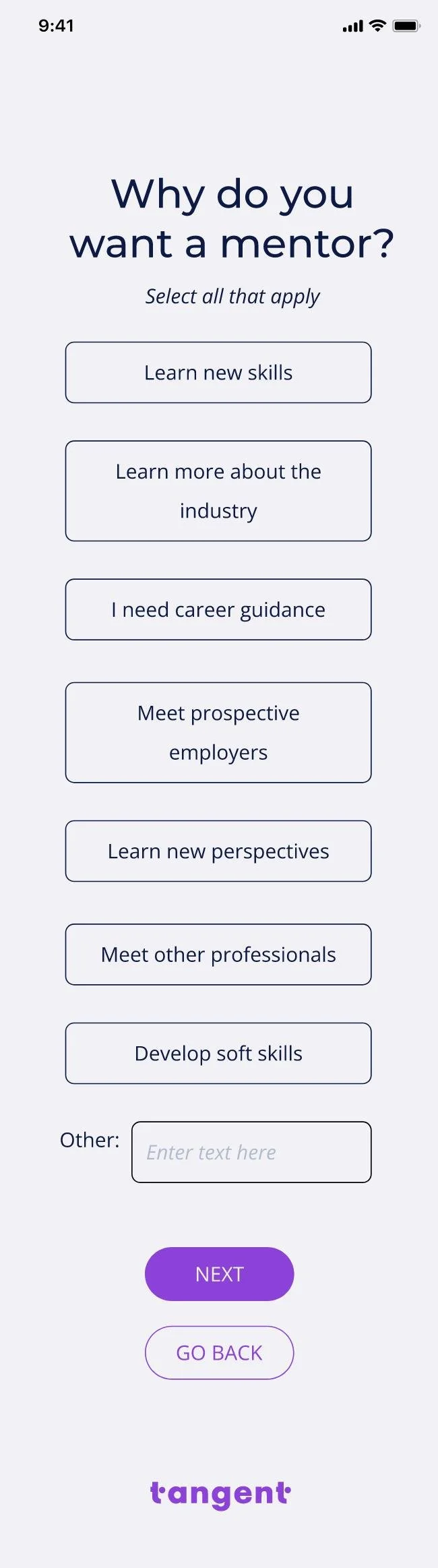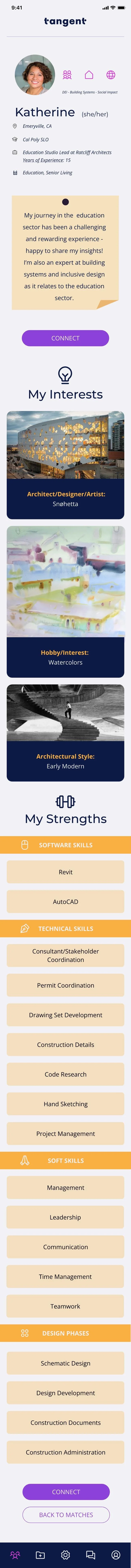 Tangent is a mobile-app that helps architecture professionals and emerging architects find mentors by providing a thoughtful mentor/mentee matching system, creating opportunities to chat and connect (in person or virtually), and providing tools for mentorship structuring and accountability.