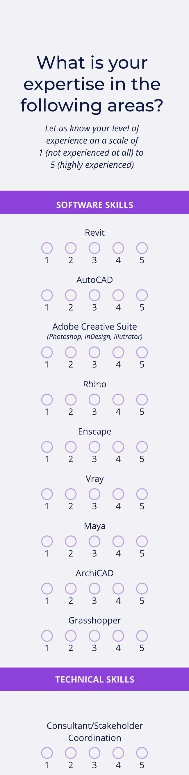 To better understand about sent out a initial survey to about 20 local Bay Area architecture professionals and architecture students at University of San Francisco.