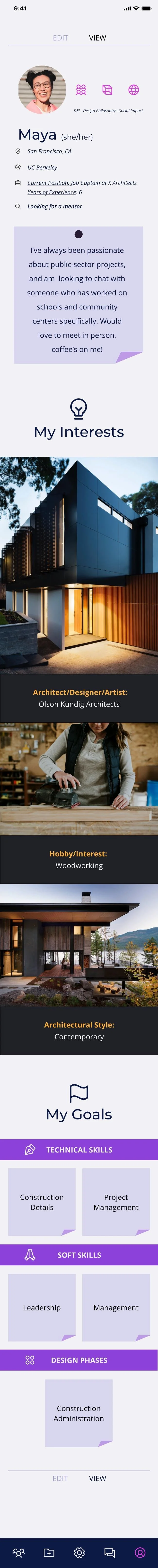For the mentee profile and mentor profile shown below, I used colors to differentiate roles (yellow for mentor and purple for mentee). These profile designs are still in progress, see my thoughts below on how the next iteration could improve the designs: